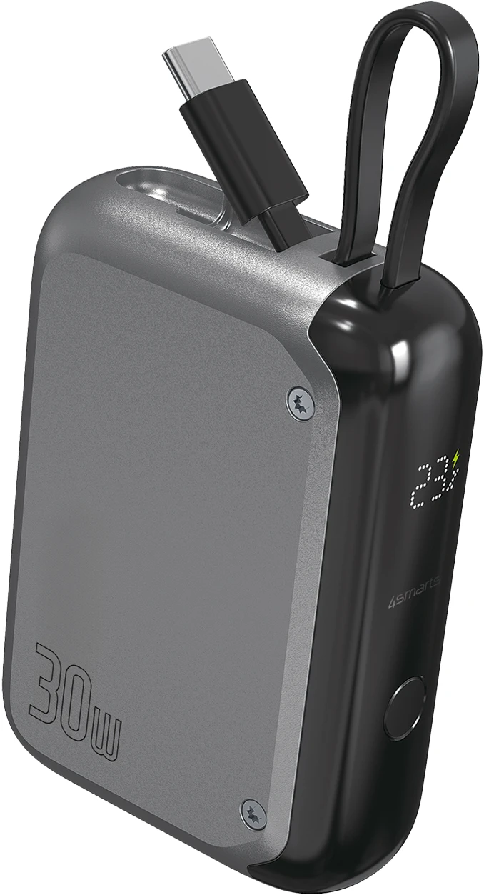 Die 4smarts Powerbank Pocket überzeugt durch ihr integriertes USB-C Kabel, sodass man kein Kabel mitnehmen muss, um ein Smartphone anzuschließen. Das ständige Suchen nach dem passenden Kabel entfällt. Lade zwei Geräte gleichzeitig mit insgesamt 30 Watt, oder verwende den zweiten USB-C Anschluss mit „Passthrough“-Funktion, um die Powerbank selbst nachzuladen, während diese ein Gerät lädt.