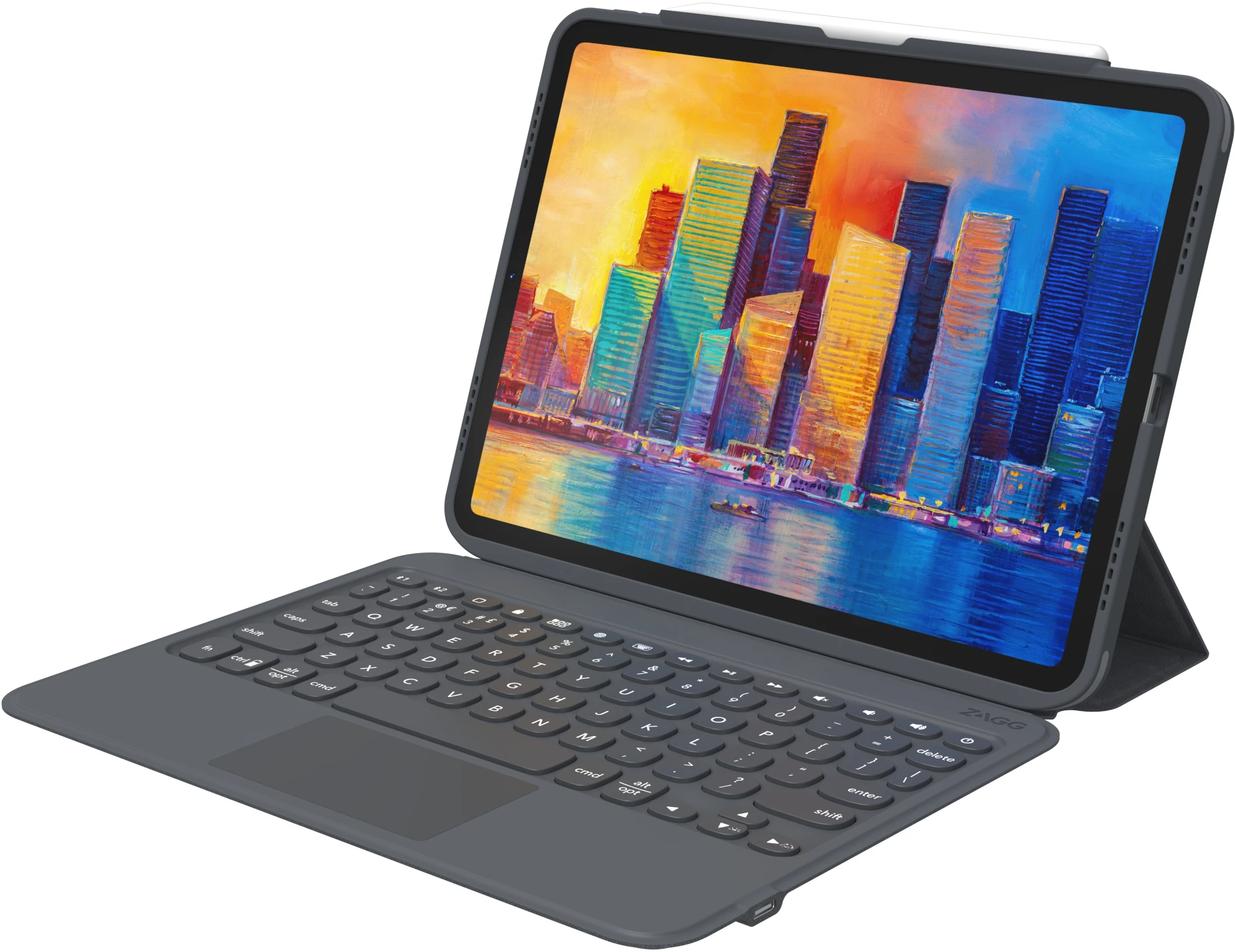 Verwandeln Sie Ihr Tablet in eine leichte, tragbare Workstation. Pro Keys with Trackpad hat einen verstellbaren Ständer, nach vorne gerichtete Lautsprecher Anschlüsse und eine Halterung für Ihren Apple Pencil oder andere Stifte. Die Tastatur und das Gehäuse lassen sich abnehmen, um sie an unterschiedliche Verwendungszwecke und Arbeitsumgebungen anzupassen.
